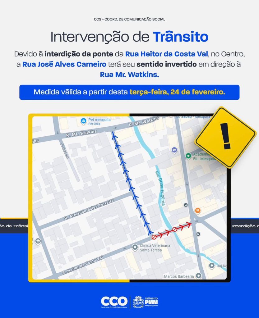 Medida altera sentido da Rua José Alves Carneiro a partir desta terça-feira, dia 24 de fevereiro A Prefeitura de Mesquita, por meio de sua Subsecretaria Municipal de Transportes e Trânsito e do Centro de Controle Operacional (CCO), informa que realiza uma intervenção viária no Centro do município em razão da interdição da ponte da Rua Heitor da Costa Val. Com a mudança, a Rua José Alves Carneiro está com o sentido invertido, passando a operar em direção à Rua Mr. Watkins. A medida entrou em vigor nesta terça-feira, dia 24 de fevereiro, e tem como objetivo organizar o fluxo de veículos e garantir mais segurança para motoristas e pedestres durante o período de interdição. A Prefeitura orienta que condutores redobrem a atenção à nova sinalização instalada no local e sigam as orientações dos agentes de trânsito. O tráfego segue sendo monitorado pelo CCO para ajustes, caso necessário. Novas atualizações serão divulgadas pelos canais oficiais do município. Não segue as redes sociais da Prefeitura de Mesquita? Então, clique aqui para seguir o canal do YouTube e aqui para acompanhar tudo que rola no Twitter Quer ler mais sobre o que acontece no município de Mesquita? Então, acesse nosso Portal de Notícias!