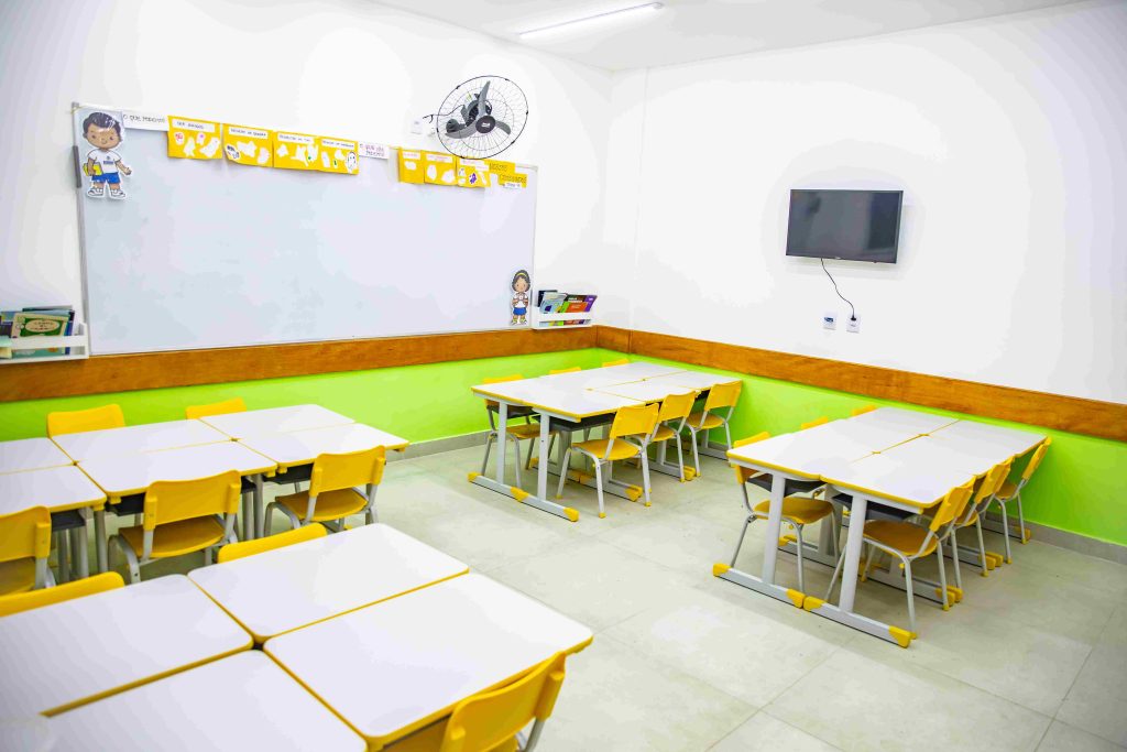 Já o pavimento superior é voltado ao Ensino Fundamental. Lá, encontram-se nove salas de aula e banheiros para receber estudantes do 1º ao 5º ano. Todas as salas da escola são climatizadas e projetadas para atender às necessidades dos alunos de forma universal.